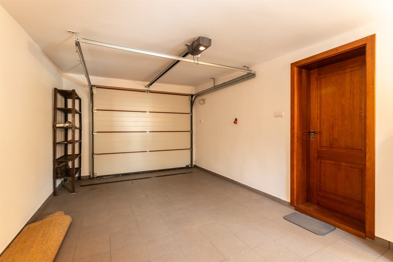 Garaż w bryle budynku oraz mały domek gospodarczy.