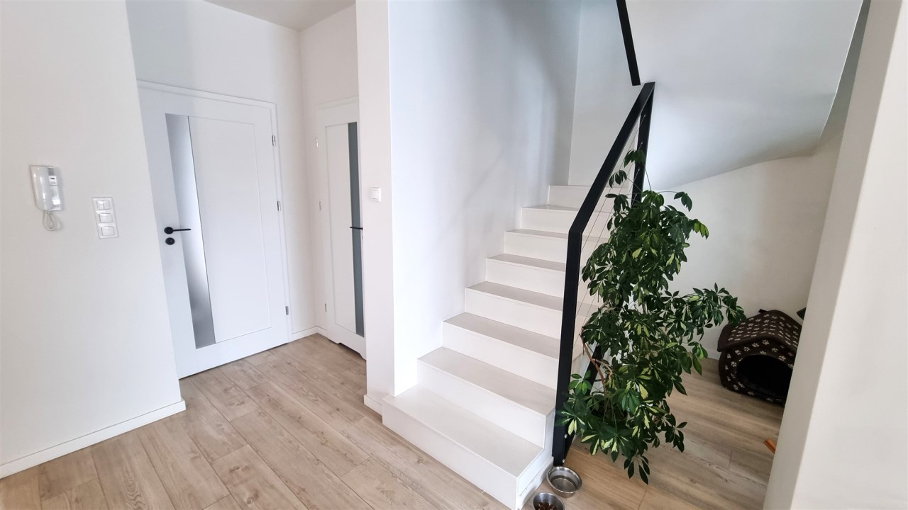 schody na piętro z nowoczesnymi metalowymi barierkami
