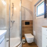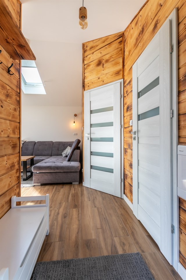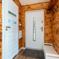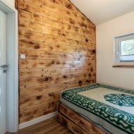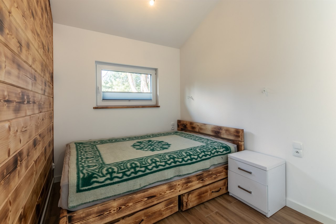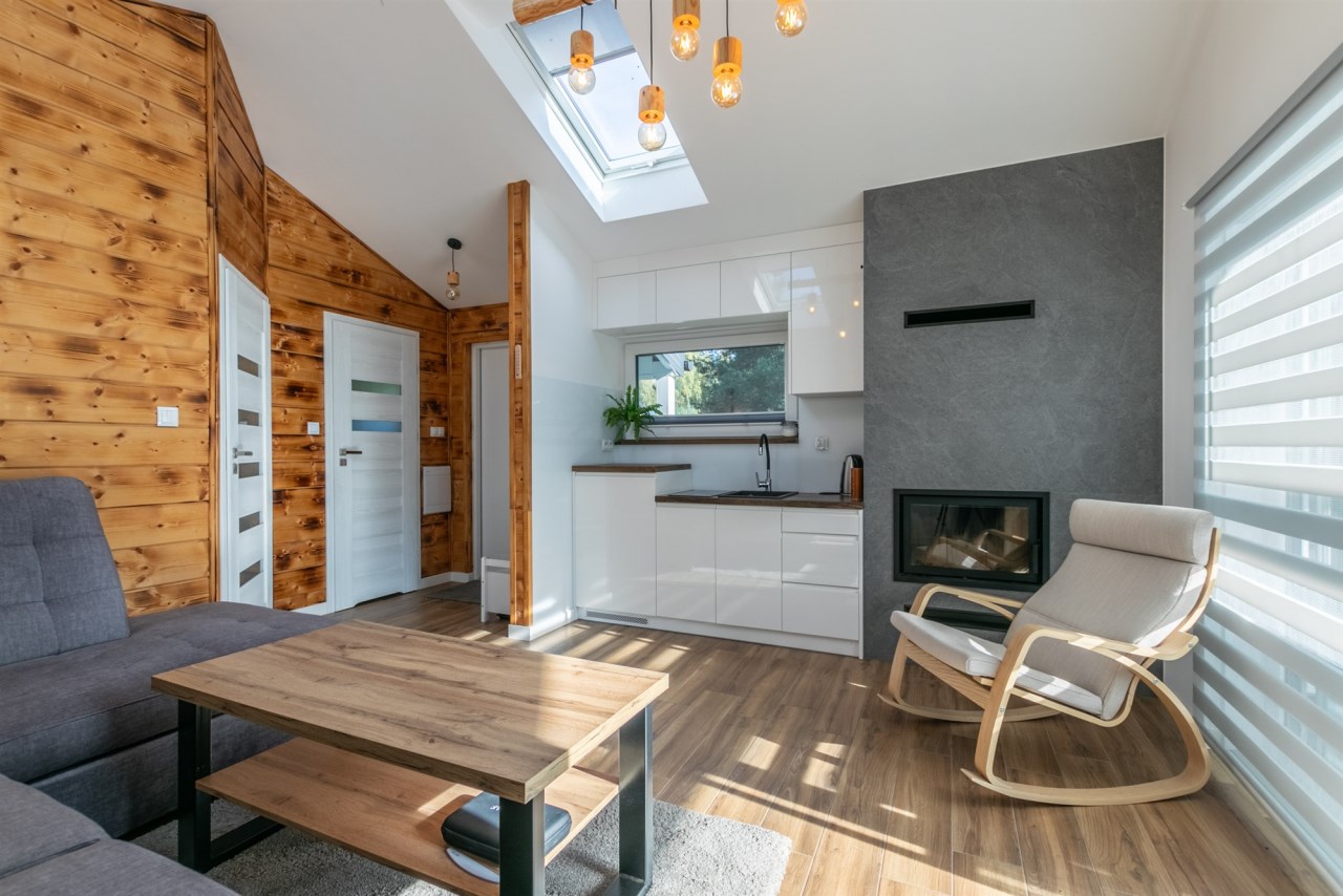 W domku znajduje się salon z kuchnią, sypialnia oraz łazienka z wc.