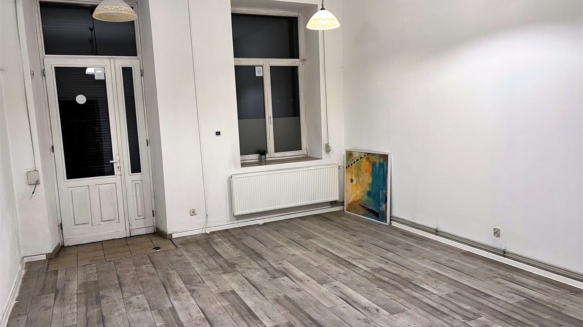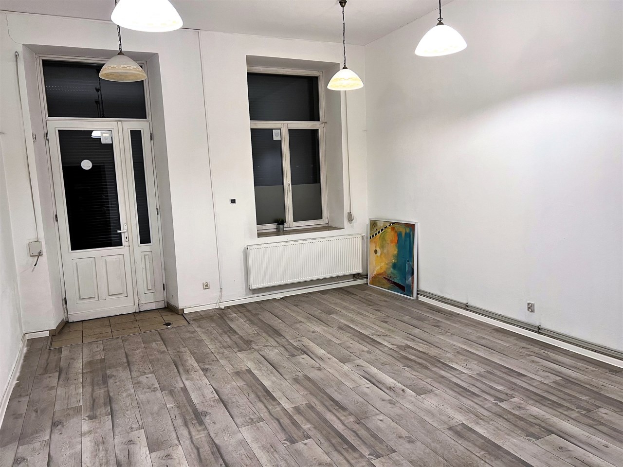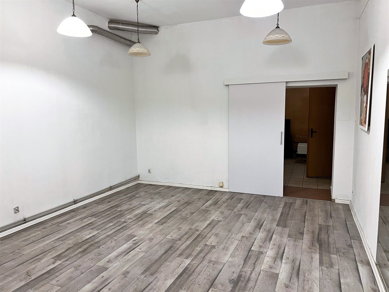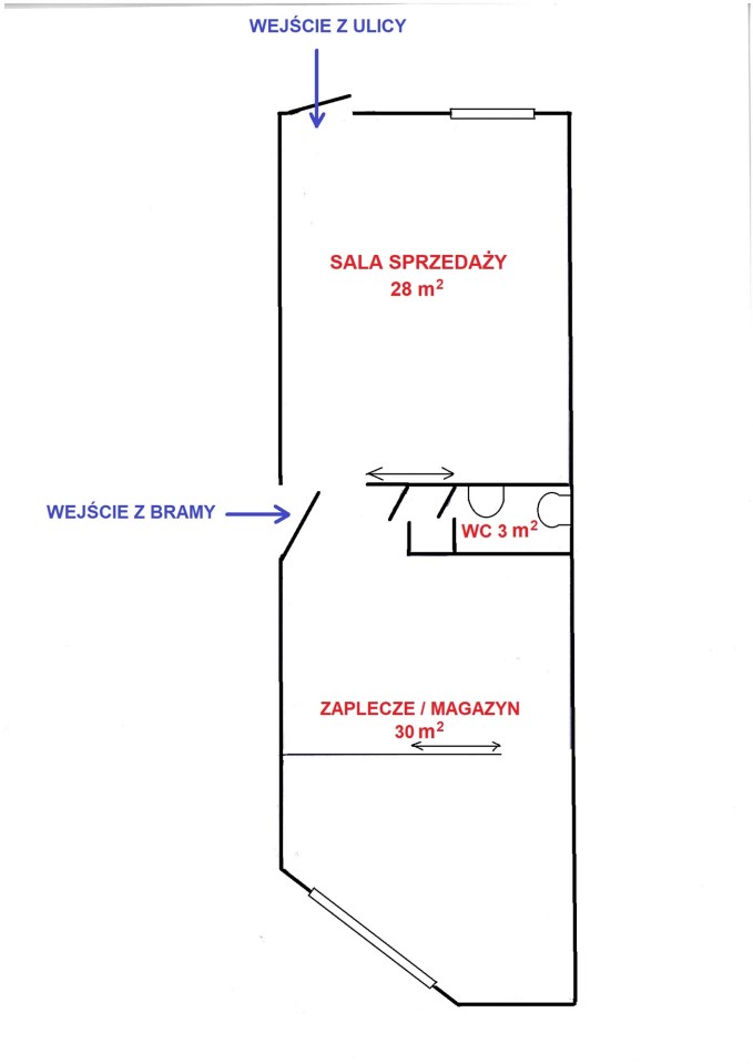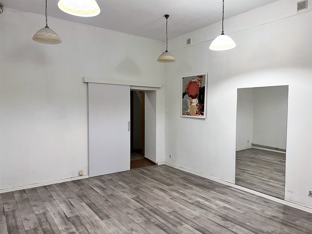 - POMIESZCZENIE I - SALA GŁÓWNA (SALA SPRZEDAŻY) - ok. 28 m, podłoga panele, ściany gładzie, oświetlenie: lampy wiszące, okno wystawowe z roletami antywłamaniowymi - wejście do tego pomieszczenia bezpośrednio z ulicy, do pozostałej części lokalu wejście przez drzwi przesuwne,