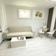 W przedpokoju szafa, w salonie sofa z funkcją spania, stół i krzesła,