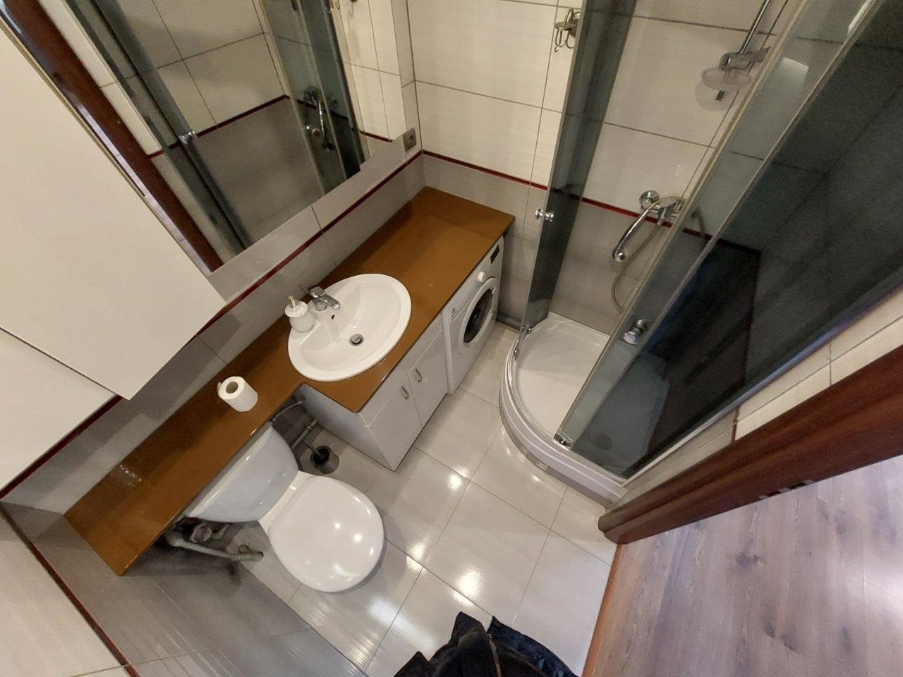 ŁAZIENKA z WC- kabina prysznicowa, umywalka, szafka na kosmetyki, pralka