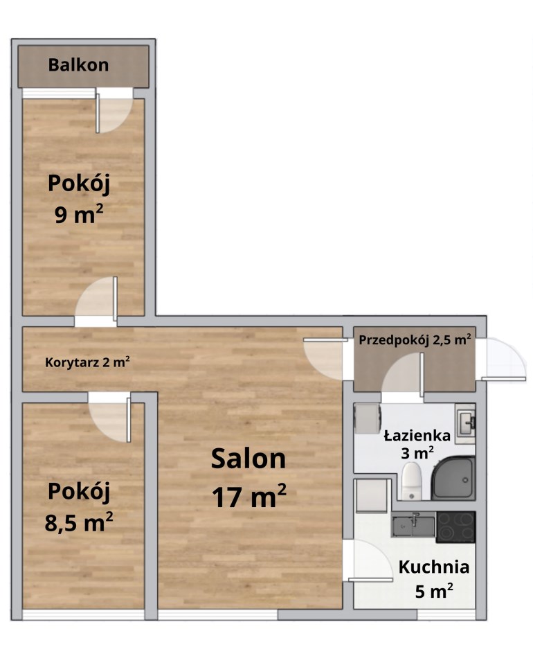 Łączna powierzchnia: 47 m² + balkon + piwnica.
