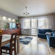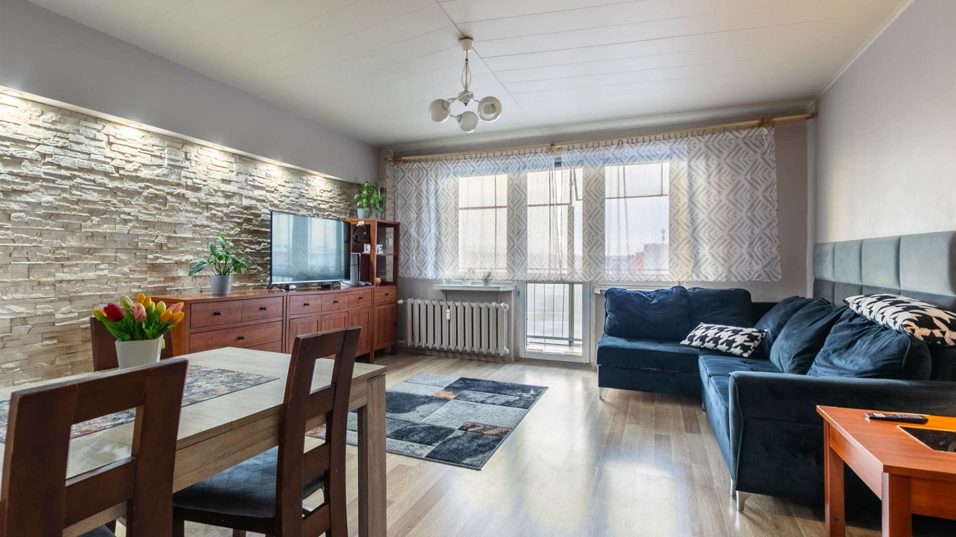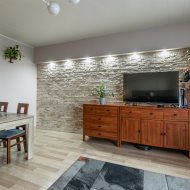 W mieszkaniu ściany - gładź malowana, kamień ozdobny, podłogi panele.