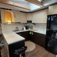 Składa się z: dużego salonu z otwartą kuchnią kompleksowo urządzoną i wyposażoną, dwóch sypialni, dużej łazienki z wanną i kabiną prysznicową, toaletą i pralką.