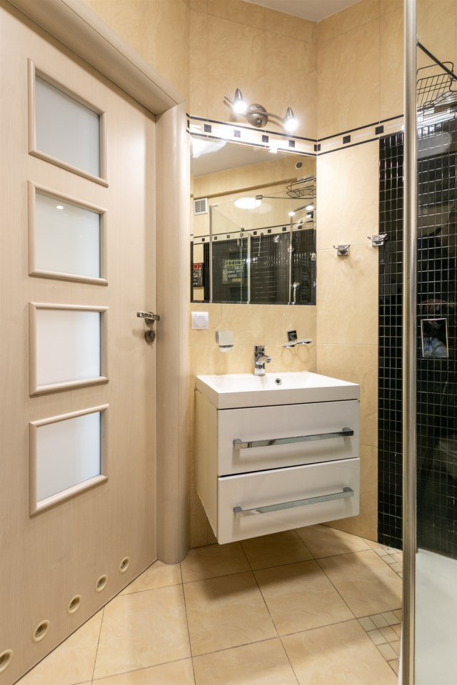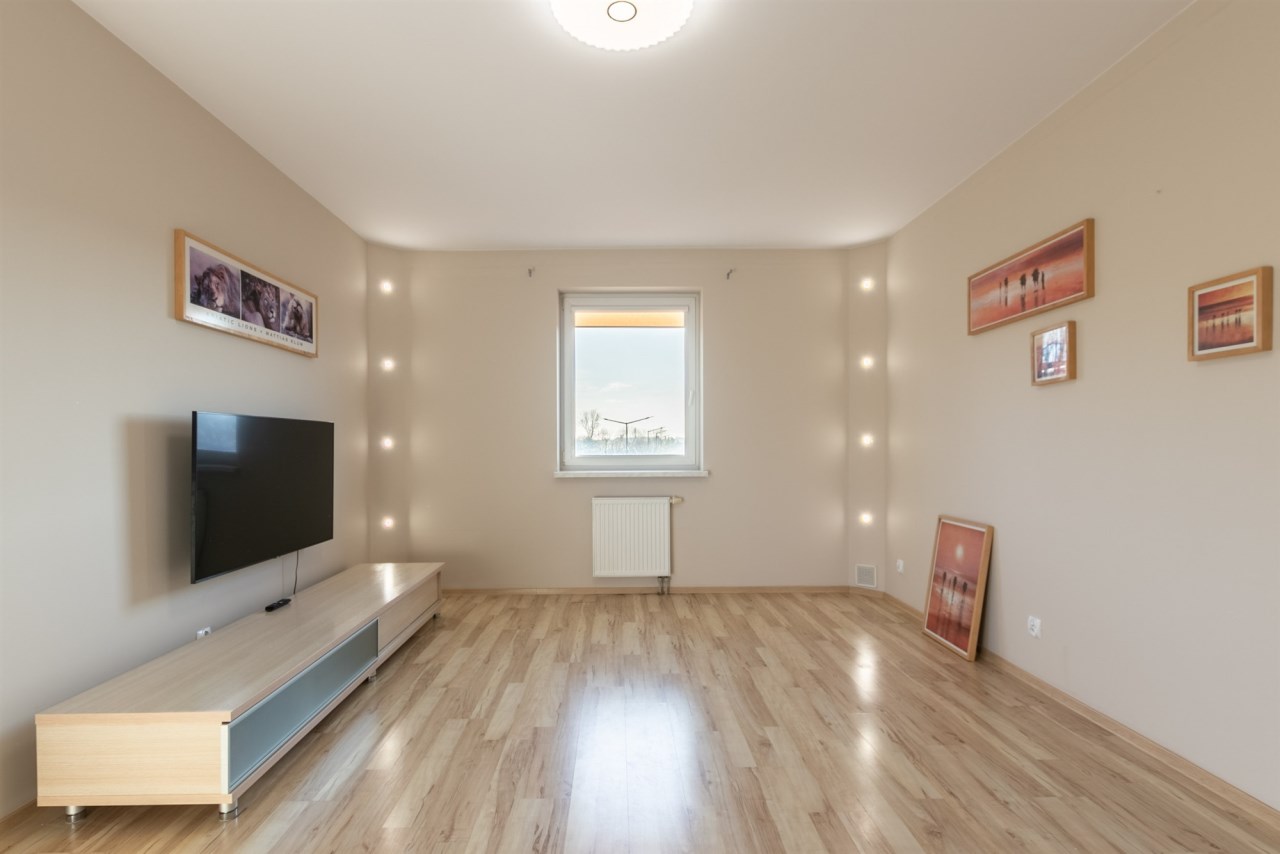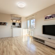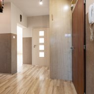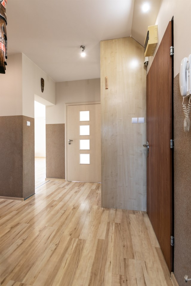 Mieszkanie zostało odmalowane w kolorach beżu, na podłogach leżą panele.