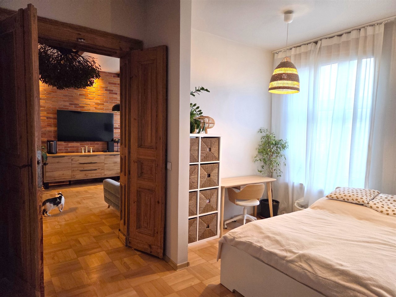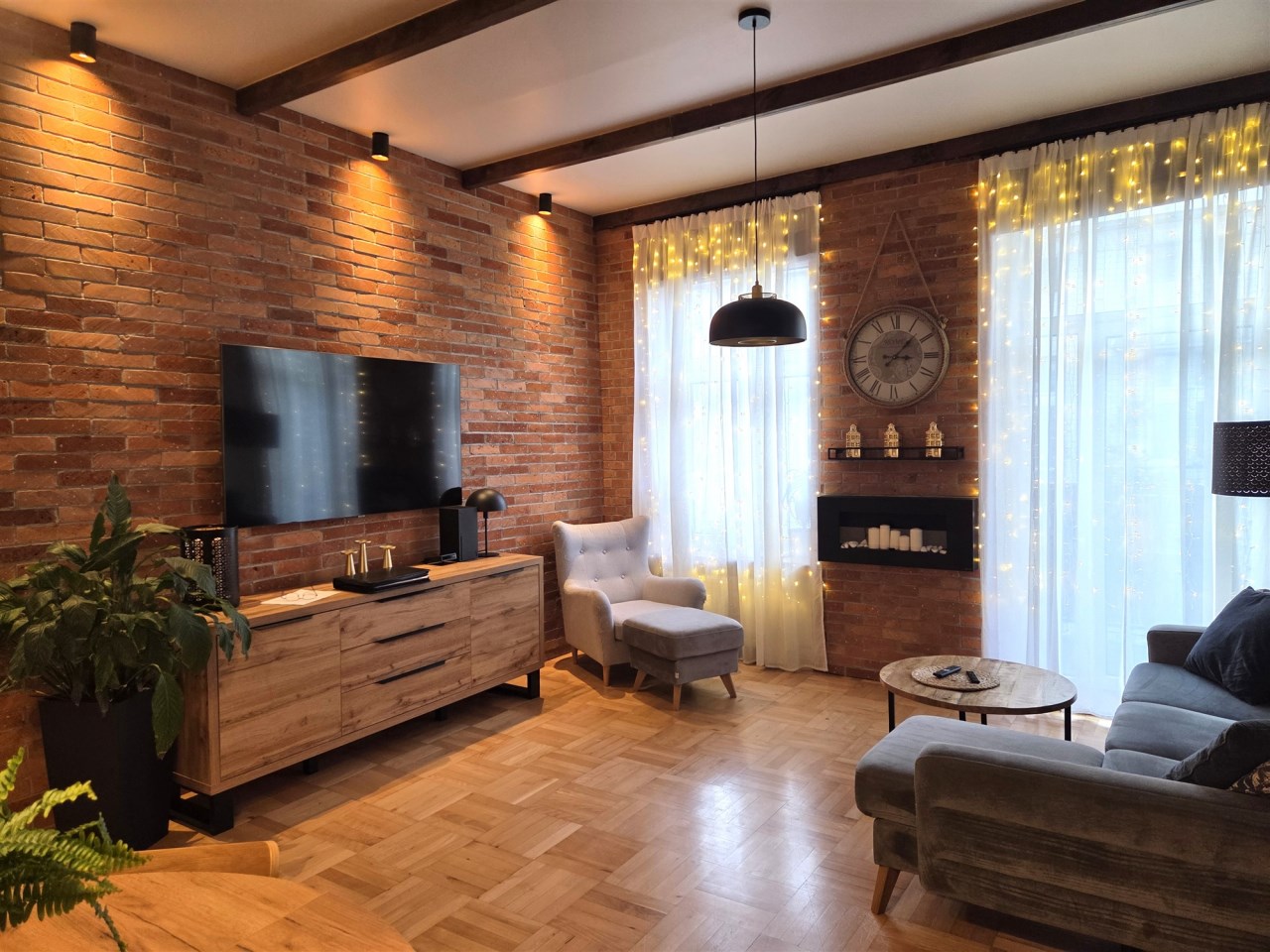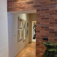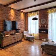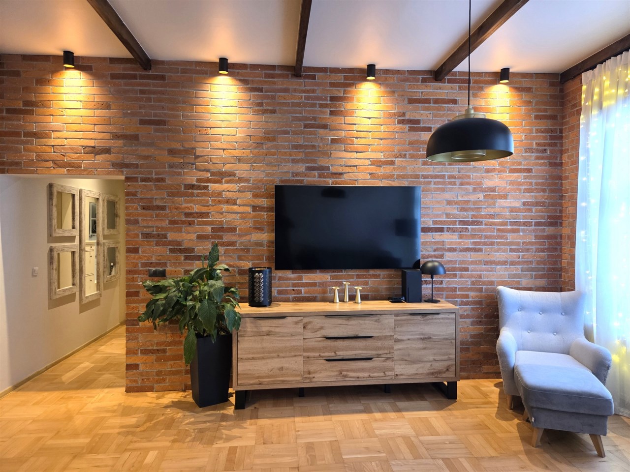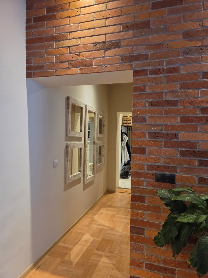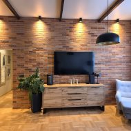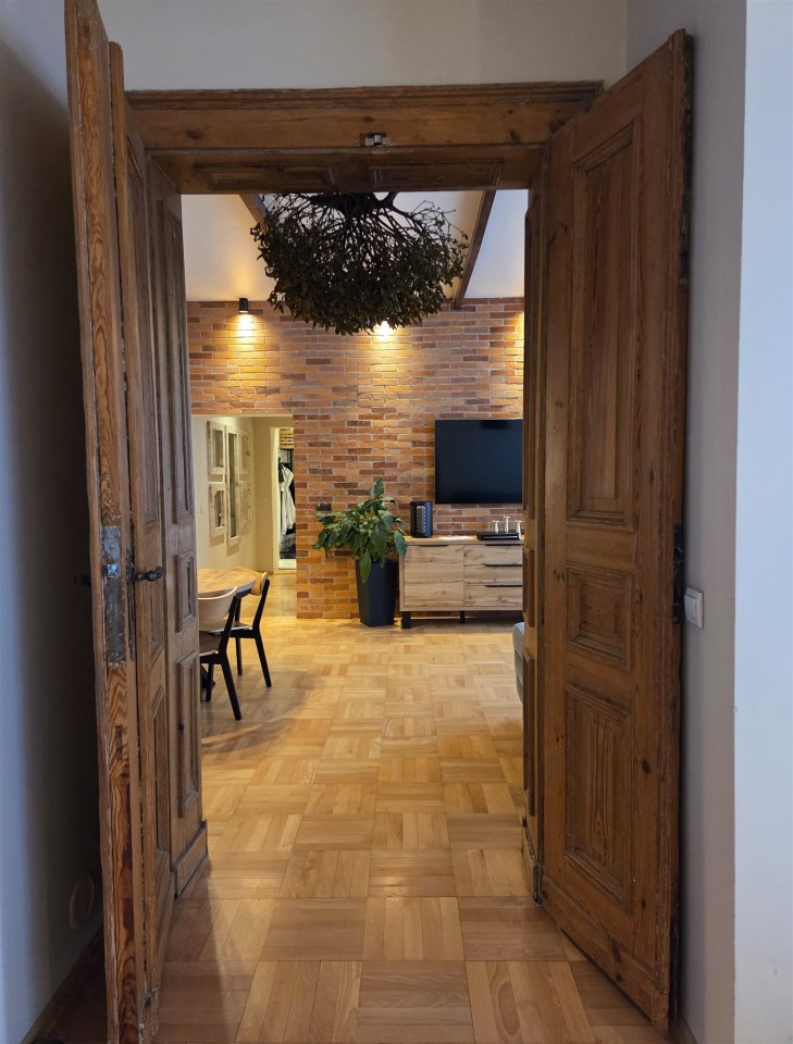 Loftowy charakter apartamentu podkreśla ściana wykonana z prawdziwej cegły oraz piękne drewniane drzwi łączące salon z częścią sypialnianą. Ponadto uwagę zwracają przemyślane rozwiązania oświetleniowe.