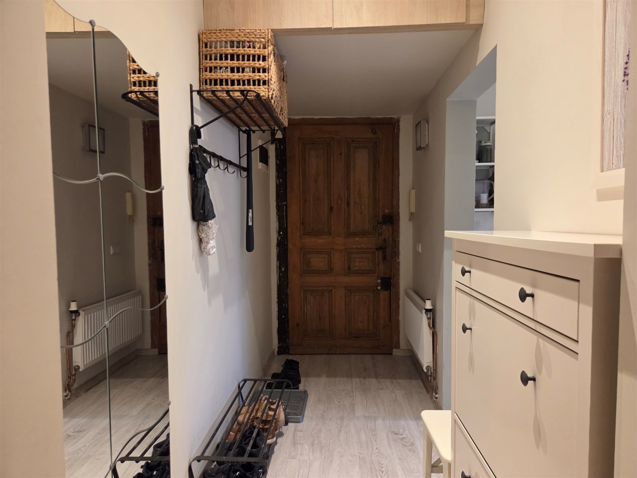 - przedpokój wyposażony w pojemną szafę w zabudowie oraz duży pawlacz nad drzwiami wejściowymi,