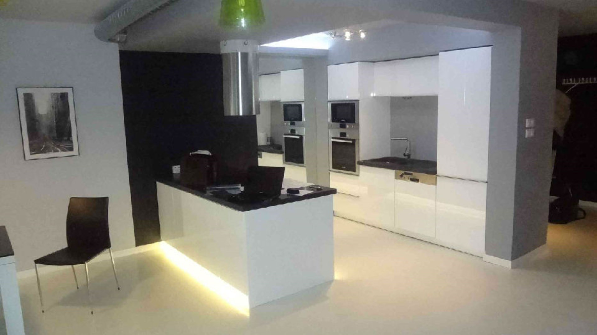 - ANEKS KUCHENNY + JADALNIA: całość połączona z salonem, w jadalni stół z blatem szklanym + 4 krzesła, kuchnia z wyspą (indukcyjna, 4-palnikowa płyta grzewcza), kompletnie umeblowana i wyposażona, lodówka z zamrażarką, zmywarka, wbudowana kuchenka mikrofalowa i piekarnik, komplet garnków sztućców itp., duża szafa z 5 drzwiami przesuwnymi, odkurzacz, deska do prasowania, żelazko, zestaw do sprzątania (mop itp.,)