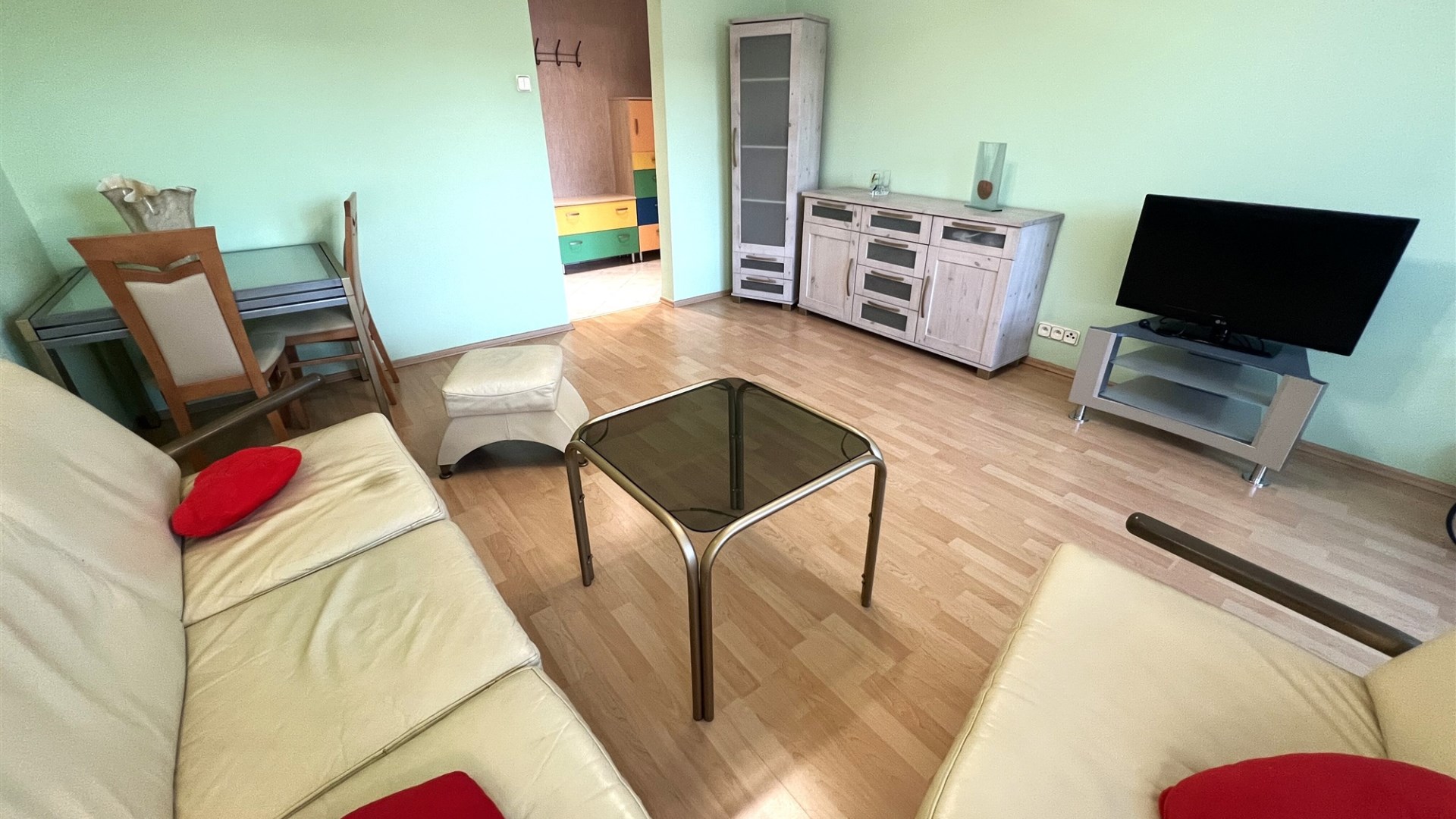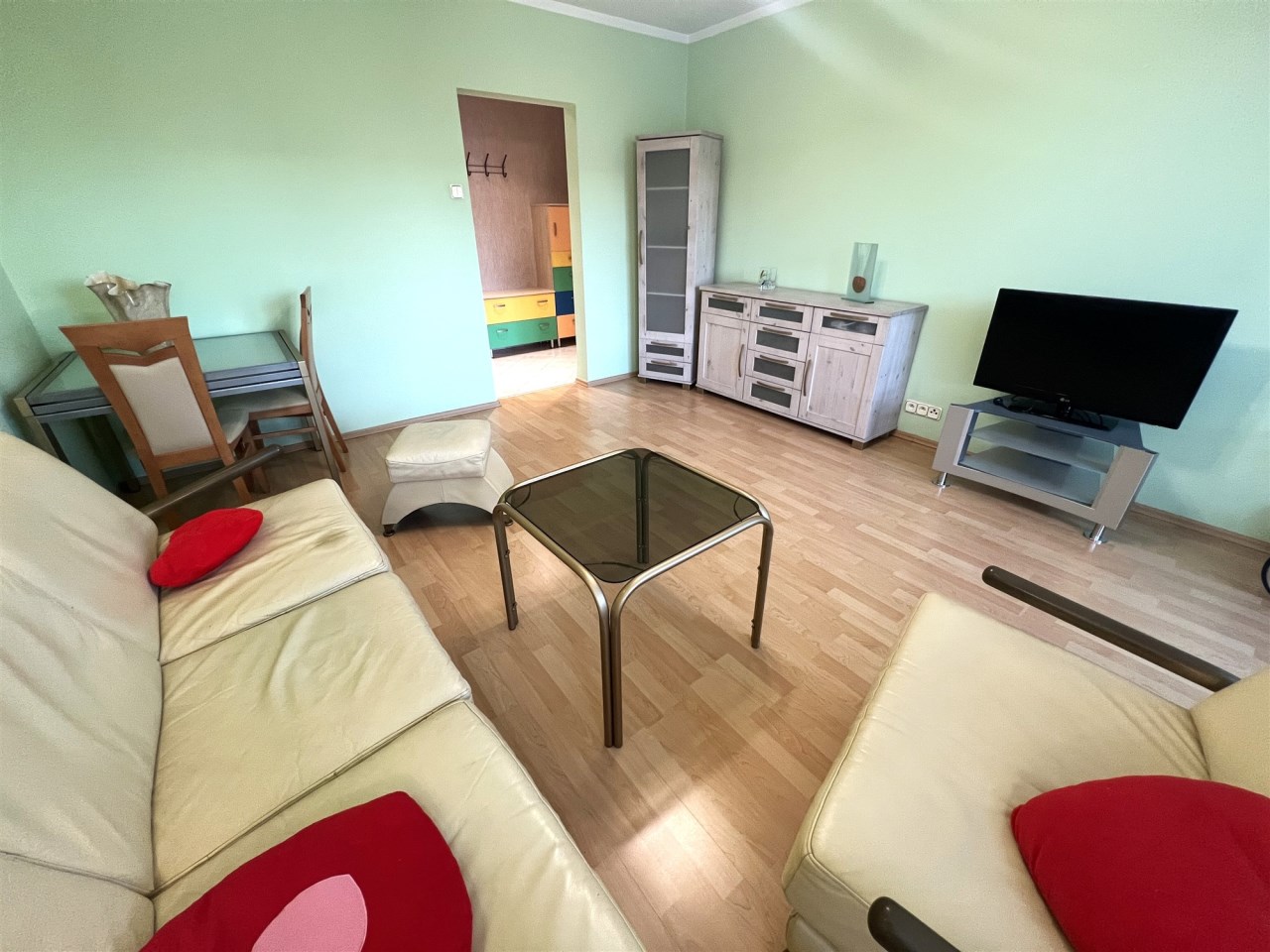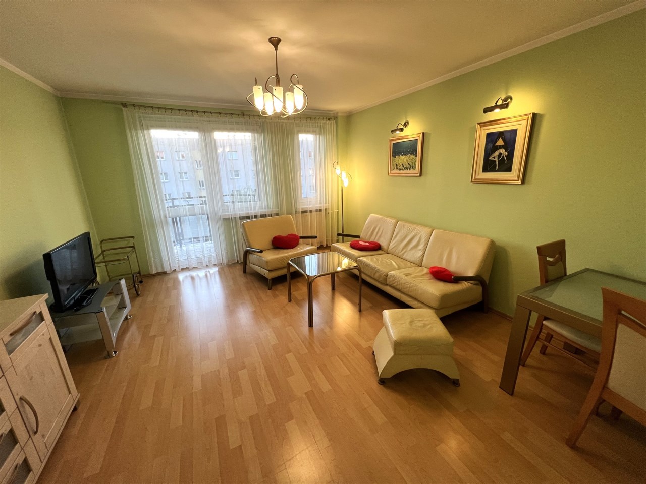 - SALON: witryna, komoda, kanapa (nierozkładana), fotel, pufa - skóra , telewizor i stolik pod telewizor, ława szklana, stół + 2 krzesła, dywan, lampa stojąca, lampa górna wisząca,