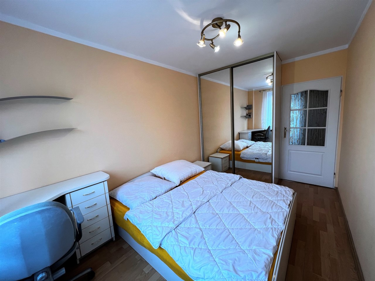 - SYPIALNIA: gładzie, łóżko podwójne, szafka nocna, toaletka, biurko + fotel obrotowy, firany, szafa garderoba w zabudowie,