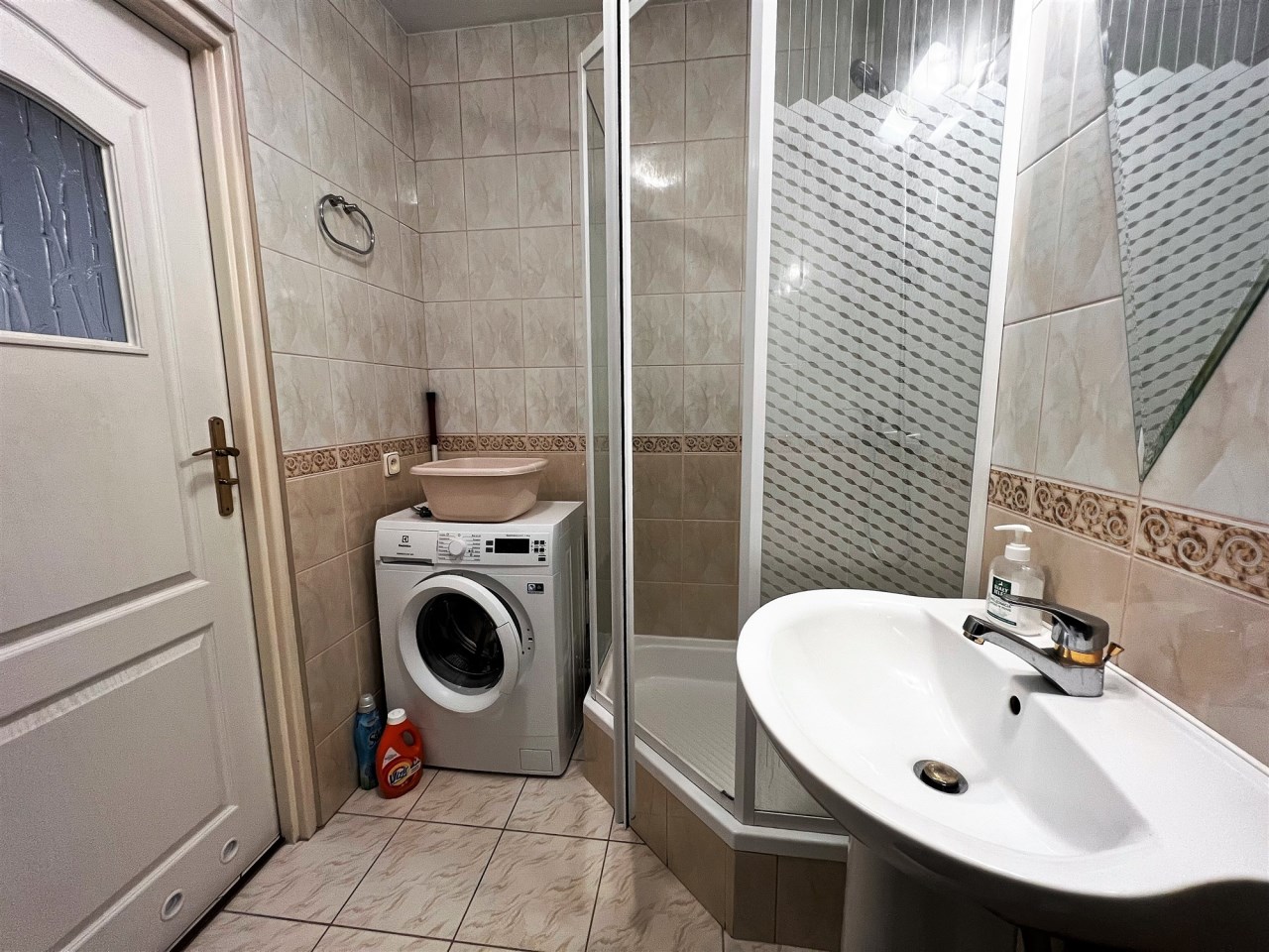 - ŁAZIENKA Z WC: glazura, terakota, kabina prysznicowa, nowa pralka, sedes, bidet, umywalka z nogą, półki szklane,