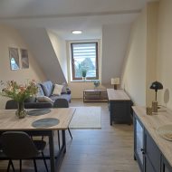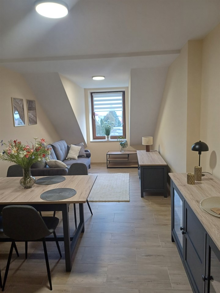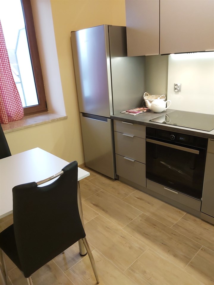 Mieszkanie wyposażone w zestaw mebli kuchennych z urządzeniami(lodówka, zamrażarka, kuchnia z piekarnikiem , zmywarka) +stół z krzesłami, komoda. pokoje umeblowane łóżka, szafy, biuro.