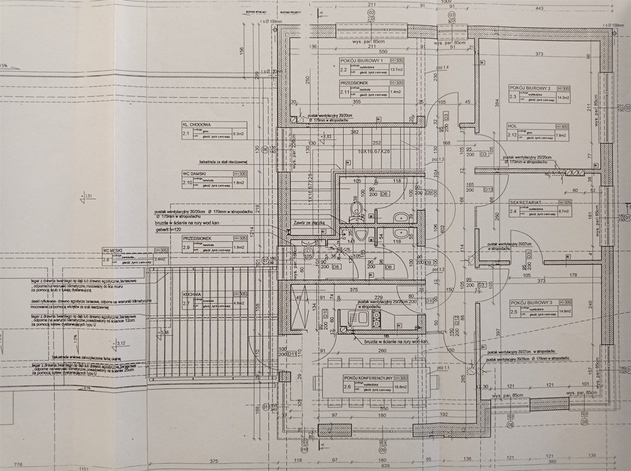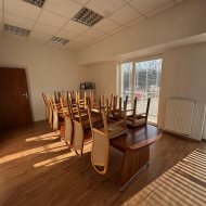 Na pierwszym piętrze otwarty aneks kuchenny, 3 biura, sala konferencyjna na ok. 30 osób z kuchnią, łazienka damska i męska,